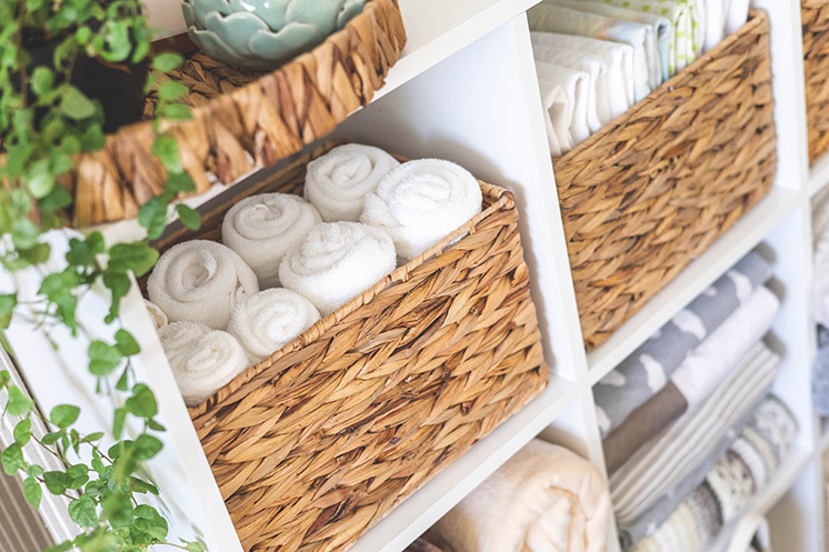 - ŁATWO, SZYBKO, TANIO: kup puszyste miękkie ręczniki i dywanik łazienkowy z niebielonej bawełny oraz praktyczne koszyki z wikliny, morskiej trawy lub hiacynta wodne; wykorzystaj dodatki z taeku czy z jasnobeżowej kamionki.