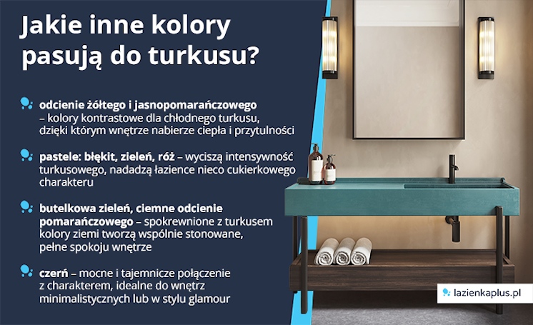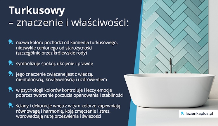 Na kole barw turkusowy znajduje się między niebieskim, a zielonym i ma coś z obu tych kolorów. Jasny, jest bliższy niebieskiemu, natomiast ciemny – zielonemu. Może posiadać różne nasycenie i wiele odcieni, od bardzo subtelnych, aż po intensywne i bardzo zdecydowane. Niezależnie od wariantu, stanowi mocny akcent, który budzi przyjemne skojarzenia. Przypomina piękny koloryt oceanu, morza lub jeziora, ożywiając wspomnienia z beztroskich wakacji. Wprowadza do pomieszczeń świeżość i pozytywną energię, nic więc dziwnego, że jest tak chętnie wybierany do tych bezpośrednio związanych z wodą i relaksem, takich jak łazienka.