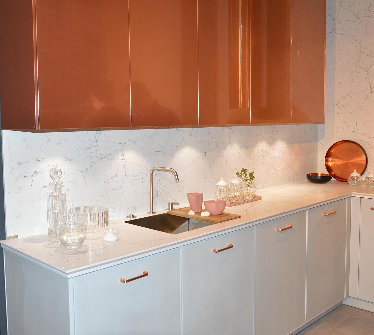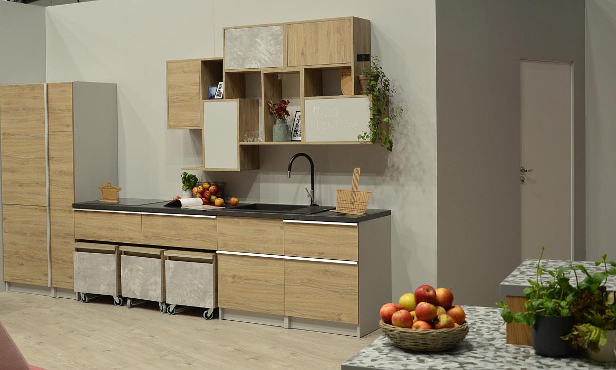 Ponadto, mówiąc stricte o kuchniach, to tu również górowały podobne trendy jak w przypadku łazienek. Nie obyło się bez mebli i dodatków z elementami złota lub miedzi. Królowało drewno, imitacja marmuru, szkło, czerń, szarość oraz biel. Znalazły się również stoiska z typowymi rozwiązaniami skandynawskimi, czyli aranżacje kuchni jasnych i lekkich.