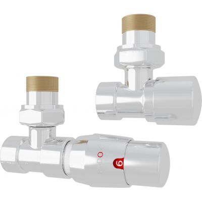 Zestaw termostatyczny RX-122T (kątowy) GW1/2 przeznaczony jest do montażu na grzejnikach (łazienkowych lub dekoracyjnych) centralnego ogrzewania po stronie przewodu zasilającego. W zestawie z głowicą termostatyczną regulują ilość czynnika grzewczego wpływającego do grzejnika. Zwiększając ilość ciepłej wody dostarczanej do grzejnika zawór podnosi temperaturę w pomieszczeniu, a zmniejszając ilość wpływającej wody obniża temperaturę. Taka regulacja pozwala na zachowanie komfortowej temperatury w pomieszczeniu niezależnie od warunków pogodowych panujących na zewnątrz, a jednocześnie przyczynia się do znacznej redukcji kosztów ogrzewania zmniejszając zużycie energii. Zawór odcinający montowany jest na grzejniku centralnego ogrzewania po stronie przewodu powrotnego. Zapewnia precyzyjne zrównoważenie każdego obiegu grzejnikowego, co wpływa na poprawę komfortu cieplnego i lepszą wydajność zaworów.