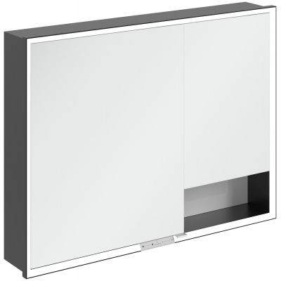 Okalająca lustro taśma LED zapewnia równomierne oświetlenie, a zintegrowane oświetlenie umywalki i podświetlane otwarte komory tworzą nastrojową atmosferę. Jasność i temperaturę barwową można wygodnie regulować za pomocą czujnika lub sterownika Smart Home. Delikatne uchwyty pozwalają na wygodne otwieranie drzwi bez pozostawiania odcisków palców, a podwójne gniazdko w środku zapewnia dodatkową funkcjonalność.