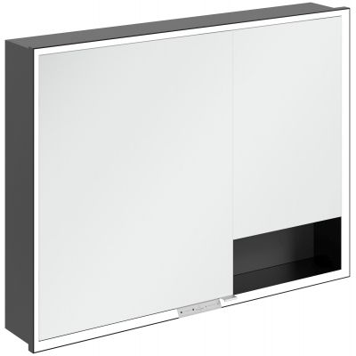 Okalająca lustro taśma LED zapewnia równomierne oświetlenie, a zintegrowane oświetlenie umywalki i podświetlane otwarte komory tworzą nastrojową atmosferę. Jasność i temperaturę barwową można wygodnie regulować za pomocą czujnika lub sterownika Smart Home. Delikatne uchwyty pozwalają na wygodne otwieranie drzwi bez pozostawiania odcisków palców, a podwójne gniazdko w środku zapewnia dodatkową funkcjonalność.