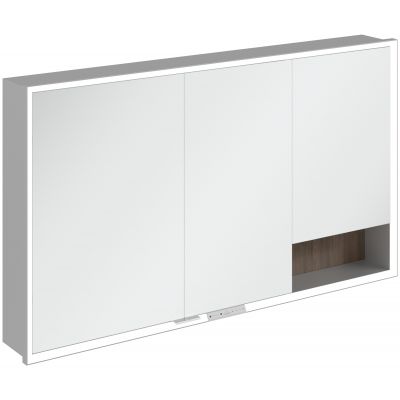Okalająca lustro taśma LED zapewnia równomierne oświetlenie, a zintegrowane oświetlenie umywalki i podświetlane otwarte komory tworzą nastrojową atmosferę. Jasność i temperaturę barwową można wygodnie regulować za pomocą czujnika lub sterownika Smart Home. Delikatne uchwyty pozwalają na wygodne otwieranie drzwi bez pozostawiania odcisków palców, a podwójne gniazdko w środku zapewnia dodatkową funkcjonalność.