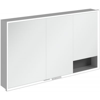 Okalająca lustro taśma LED zapewnia równomierne oświetlenie, a zintegrowane oświetlenie umywalki i podświetlane otwarte komory tworzą nastrojową atmosferę. Jasność i temperaturę barwową można wygodnie regulować za pomocą czujnika lub sterownika Smart Home. Delikatne uchwyty pozwalają na wygodne otwieranie drzwi bez pozostawiania odcisków palców, a podwójne gniazdko w środku zapewnia dodatkową funkcjonalność.