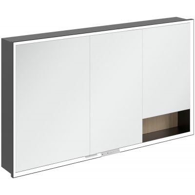 Okalająca lustro taśma LED zapewnia równomierne oświetlenie, a zintegrowane oświetlenie umywalki i podświetlane otwarte komory tworzą nastrojową atmosferę. Jasność i temperaturę barwową można wygodnie regulować za pomocą czujnika lub sterownika Smart Home. Delikatne uchwyty pozwalają na wygodne otwieranie drzwi bez pozostawiania odcisków palców, a podwójne gniazdko w środku zapewnia dodatkową funkcjonalność.