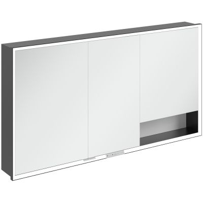 Okalająca lustro taśma LED zapewnia równomierne oświetlenie, a zintegrowane oświetlenie umywalki i podświetlane otwarte komory tworzą nastrojową atmosferę. Jasność i temperaturę barwową można wygodnie regulować za pomocą czujnika lub sterownika Smart Home. Delikatne uchwyty pozwalają na wygodne otwieranie drzwi bez pozostawiania odcisków palców, a podwójne gniazdko w środku zapewnia dodatkową funkcjonalność.