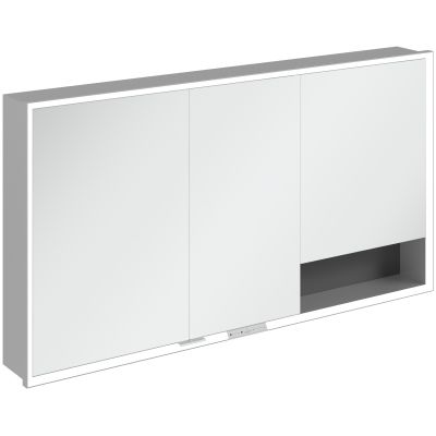 Okalająca lustro taśma LED zapewnia równomierne oświetlenie, a zintegrowane oświetlenie umywalki i podświetlane otwarte komory tworzą nastrojową atmosferę. Jasność i temperaturę barwową można wygodnie regulować za pomocą czujnika lub sterownika Smart Home. Delikatne uchwyty pozwalają na wygodne otwieranie drzwi bez pozostawiania odcisków palców, a podwójne gniazdko w środku zapewnia dodatkową funkcjonalność.