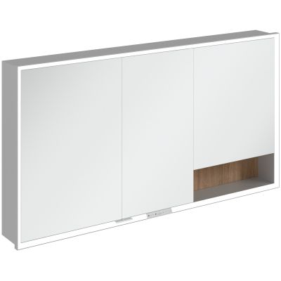 Okalająca lustro taśma LED zapewnia równomierne oświetlenie, a zintegrowane oświetlenie umywalki i podświetlane otwarte komory tworzą nastrojową atmosferę. Jasność i temperaturę barwową można wygodnie regulować za pomocą czujnika lub sterownika Smart Home. Delikatne uchwyty pozwalają na wygodne otwieranie drzwi bez pozostawiania odcisków palców, a podwójne gniazdko w środku zapewnia dodatkową funkcjonalność.