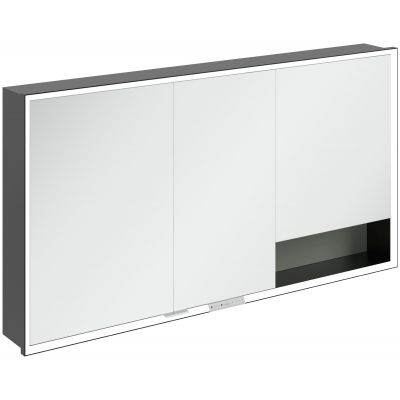 Okalająca lustro taśma LED zapewnia równomierne oświetlenie, a zintegrowane oświetlenie umywalki i podświetlane otwarte komory tworzą nastrojową atmosferę. Jasność i temperaturę barwową można wygodnie regulować za pomocą czujnika lub sterownika Smart Home. Delikatne uchwyty pozwalają na wygodne otwieranie drzwi bez pozostawiania odcisków palców, a podwójne gniazdko w środku zapewnia dodatkową funkcjonalność.
