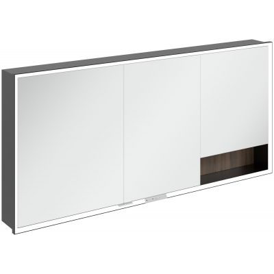 Okalająca lustro taśma LED zapewnia równomierne oświetlenie, a zintegrowane oświetlenie umywalki i podświetlane otwarte komory tworzą nastrojową atmosferę. Jasność i temperaturę barwową można wygodnie regulować za pomocą czujnika lub sterownika Smart Home. Delikatne uchwyty pozwalają na wygodne otwieranie drzwi bez pozostawiania odcisków palców, a podwójne gniazdko w środku zapewnia dodatkową funkcjonalność.