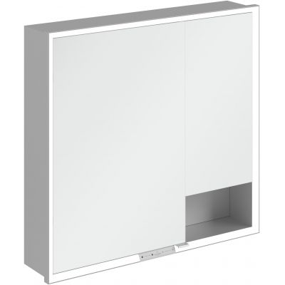 Okalająca lustro taśma LED zapewnia równomierne oświetlenie, a zintegrowane oświetlenie umywalki i podświetlane otwarte komory tworzą nastrojową atmosferę. Jasność i temperaturę barwową można wygodnie regulować za pomocą czujnika lub sterownika Smart Home. Delikatne uchwyty pozwalają na wygodne otwieranie drzwi bez pozostawiania odcisków palców, a podwójne gniazdko w środku zapewnia dodatkową funkcjonalność.