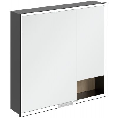 Okalająca lustro taśma LED zapewnia równomierne oświetlenie, a zintegrowane oświetlenie umywalki i podświetlane otwarte komory tworzą nastrojową atmosferę. Jasność i temperaturę barwową można wygodnie regulować za pomocą czujnika lub sterownika Smart Home. Delikatne uchwyty pozwalają na wygodne otwieranie drzwi bez pozostawiania odcisków palców, a podwójne gniazdko w środku zapewnia dodatkową funkcjonalność.