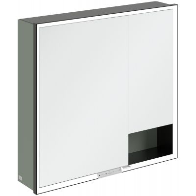 Okalająca lustro taśma LED zapewnia równomierne oświetlenie, a zintegrowane oświetlenie umywalki i podświetlane otwarte komory tworzą nastrojową atmosferę. Jasność i temperaturę barwową można wygodnie regulować za pomocą czujnika lub sterownika Smart Home. Delikatne uchwyty pozwalają na wygodne otwieranie drzwi bez pozostawiania odcisków palców, a podwójne gniazdko w środku zapewnia dodatkową funkcjonalność.