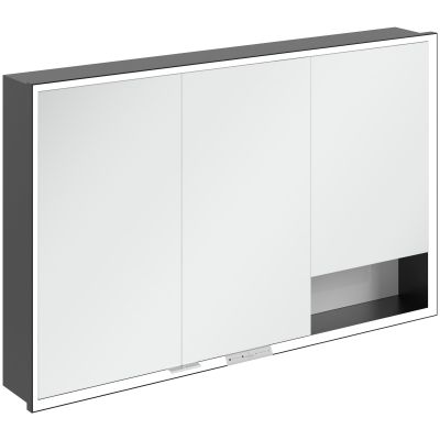Okalająca lustro taśma LED zapewnia równomierne oświetlenie, a zintegrowane oświetlenie umywalki i podświetlane otwarte komory tworzą nastrojową atmosferę. Jasność i temperaturę barwową można wygodnie regulować za pomocą czujnika lub sterownika Smart Home. Delikatne uchwyty pozwalają na wygodne otwieranie drzwi bez pozostawiania odcisków palców, a podwójne gniazdko w środku zapewnia dodatkową funkcjonalność.