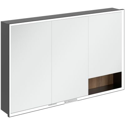 Okalająca lustro taśma LED zapewnia równomierne oświetlenie, a zintegrowane oświetlenie umywalki i podświetlane otwarte komory tworzą nastrojową atmosferę. Jasność i temperaturę barwową można wygodnie regulować za pomocą czujnika lub sterownika Smart Home. Delikatne uchwyty pozwalają na wygodne otwieranie drzwi bez pozostawiania odcisków palców, a podwójne gniazdko w środku zapewnia dodatkową funkcjonalność.