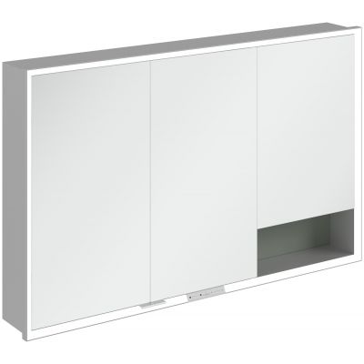 Okalająca lustro taśma LED zapewnia równomierne oświetlenie, a zintegrowane oświetlenie umywalki i podświetlane otwarte komory tworzą nastrojową atmosferę. Jasność i temperaturę barwową można wygodnie regulować za pomocą czujnika lub sterownika Smart Home. Delikatne uchwyty pozwalają na wygodne otwieranie drzwi bez pozostawiania odcisków palców, a podwójne gniazdko w środku zapewnia dodatkową funkcjonalność.