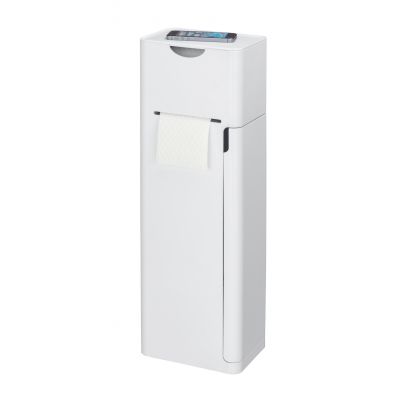 Stojak na papier toaletowy i szczotkę IMON marki WENKO to nowoczesne akcesorium do łazienki. Produkt łączy w sobie sześć funkcji: utrzymuje papier używany, przechowuje papier zapasowy i szczotkę do czyszczenia, posiada schowki na akcesoria higieny osobistej oraz półkę, na którą możesz odłożyć telefon.