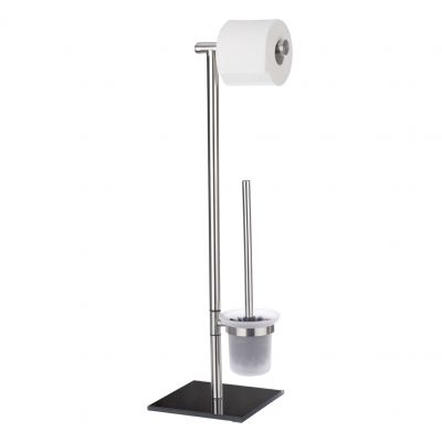 Elegancki stojak łazienkowy z serii akcesoriów łazienkowych LIMA. Łączy w sobie uchwyt na papier toaletowy, otwarty pojemnik z tworzywa sztucznego oraz szczotkę do WC. Z pewnością doda łazience eleganckiego charakteru i utrzyma niezbędne akcesoria w łatwo dostępnym miejscu. Wykonany z wysokiej jakości stali nierdzewnej. Podstawa z hartowanego szkła w kolorze czarnym. Najwyższa jakość i solidne wykonanie gwarantują długotrwałe użytkowanie.