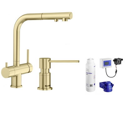 Opis zestawu Zestaw Blanco Fontas II bateria kuchenna stojąca dozownik do płynu 300 ml blatowy złoty satynowy z zestawem filtrującym wodę (526694, 526699,527453)