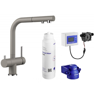 Opis zestawu Zestaw Blanco Fontas-S II bateria kuchenna stojąca tartufo/chrom z zestawem filtrującym wodę (525206, 527453)
