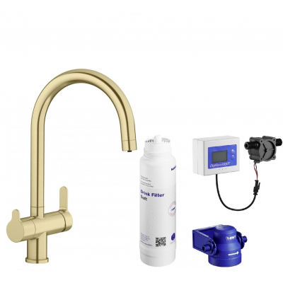 Zestaw Blanco Trima bateria kuchenna stojąca złota satynowa z zestawem filtrującym wodę (526695, 527453)