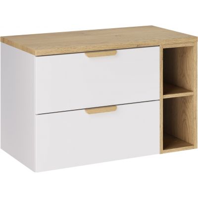 Opis zestawu Zestaw Comad Aster White szafka 60 cm podumywalkowa wisząca z blatem 80 cm i regał 20 cm otwarty biały/dąb SET-ASW B CREMONA 80CM LR