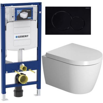 Zestaw Duravit ME by Starck miska WC wisząca z deską wolnoopadającą i stelaż podtynkowy Geberit Duofix z przyciskiem spłukującym Sigma01 czarny połysk (2530090000, 0020190000, 111320005, 115770DW5)