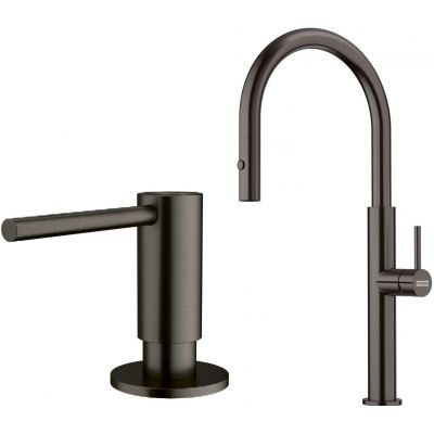 Zestaw Franke Pescara J pull-out spray bateria kuchenna stojąca z dozownikiem do płynów 350 ml antracyt (115.0741.696, 112.0717.103)