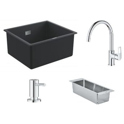 Zestaw Grohe K700 zlewozmywak granitowy czarny z baterią kuchenną Bauloop z dozownikiem i wkładką ociekową stal (31653AP0, 31368001, 40535000, 40852SD0)
