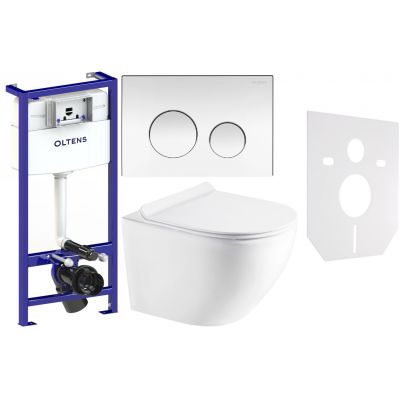 Opis zestawu Zestaw Hagser Beno miska WC wisząca z deską wolnoopadającą i stelażem podytnkowym Oltens z uszczelką i przyciskiem spłukującym chrom (HGR14000042, HGR11000045, 50001000, 57102100, 49301000)