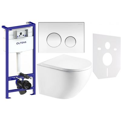 Opis zestawu Zestaw Hagser Beno miska WC wisząca z deską wolnoopadającą i stelażem podytnkowym Oltens z uszczelką i przyciskiem spłukującym chrom (HGR14000042, HGR20000045, 50001000, 57102100, 49301000)