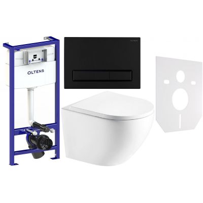 Opis zestawu Zestaw Hagser Beno miska WC wisząca z deską wolnoopadającą i stelażem podytnkowym Oltens z uszczelką i przyciskiem spłukującym czarny mat (HGR14000042, HGR20000045, 50001000, 57103300, 49301000)