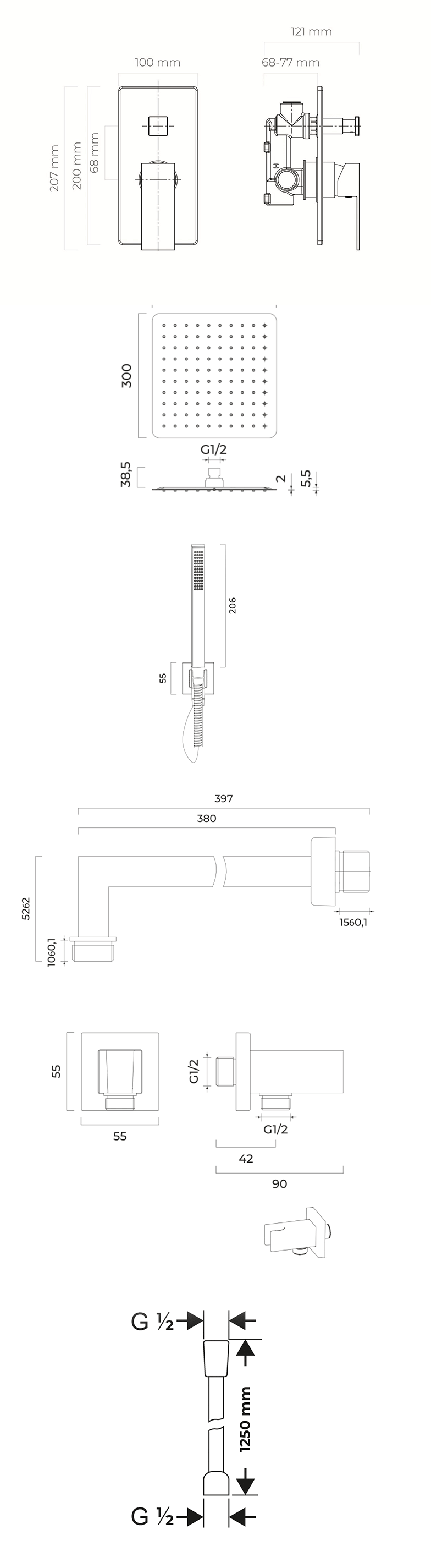 | W zestawie | bateria z przełącznikiem, deszczownica, słuchawka prysznicowa, wąż prysznicowy, ramię natrysku, przyłącze kątowe |