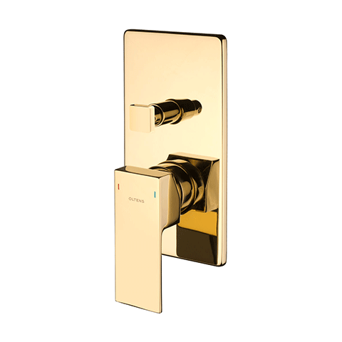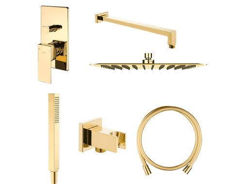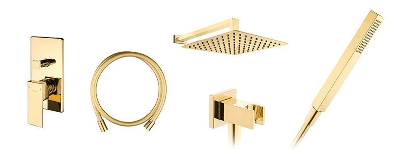 Opis zestawu Zestaw Oltens Gota bateria podtynkowa z deszczownicą 30 cm Vindel (S) i kompletem prysznicowym Sog złoty połysk 36604800