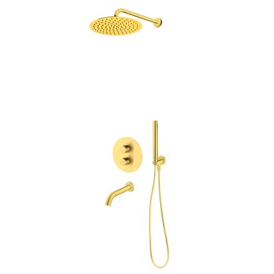 Zestaw Oltens Katla bateria podtynkowa termostatyczna z wylewką wannową Molle z deszczownicą 30 cm Vindel i kompletem prysznicowym Ume złoto szczotkowane 36611810