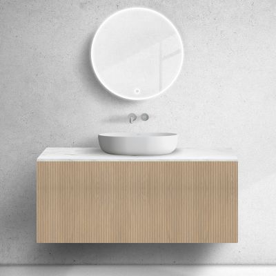 Opis zestawu Zestaw Oltens Lun szafka podumywalkowa 120 cm wisząca z blatem Tera dąb/jasny marmur 68701060