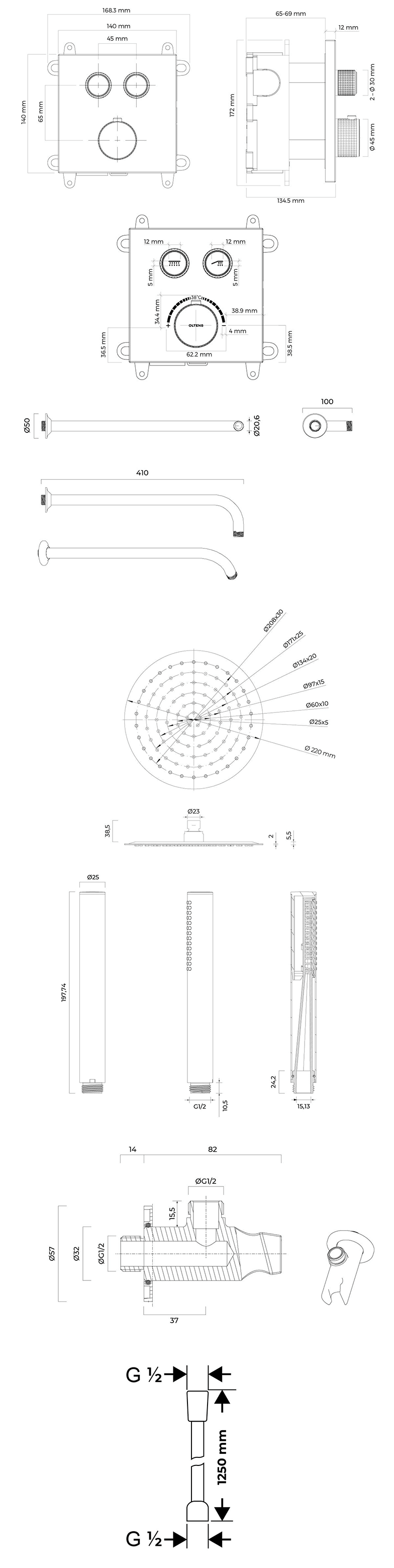 Opis zestawu Zestaw Oltens Onega (S) bateria podtynkowa z deszczownicą 22 cm Atran i kompletem prysznicowym Ume chrom 36623100
