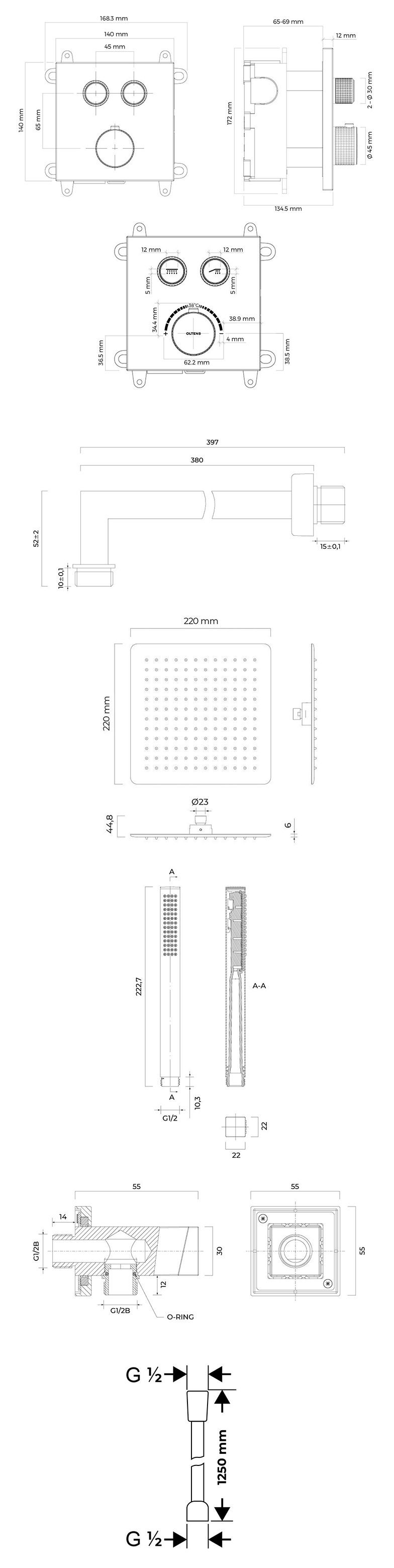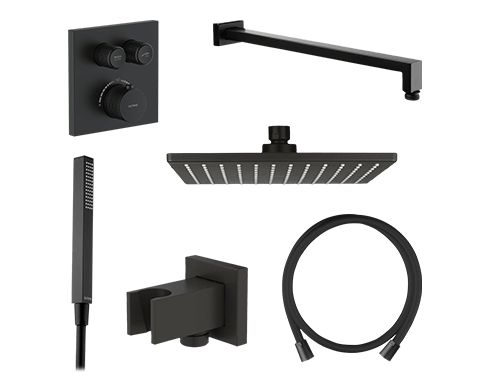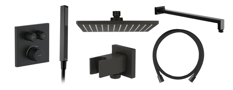 Opis zestawu Zestaw Oltens Onega (S) bateria podtynkowa z deszczownicą 22 cm Atran (S) i kompletem prysznicowym Sog czarny mat 36624300