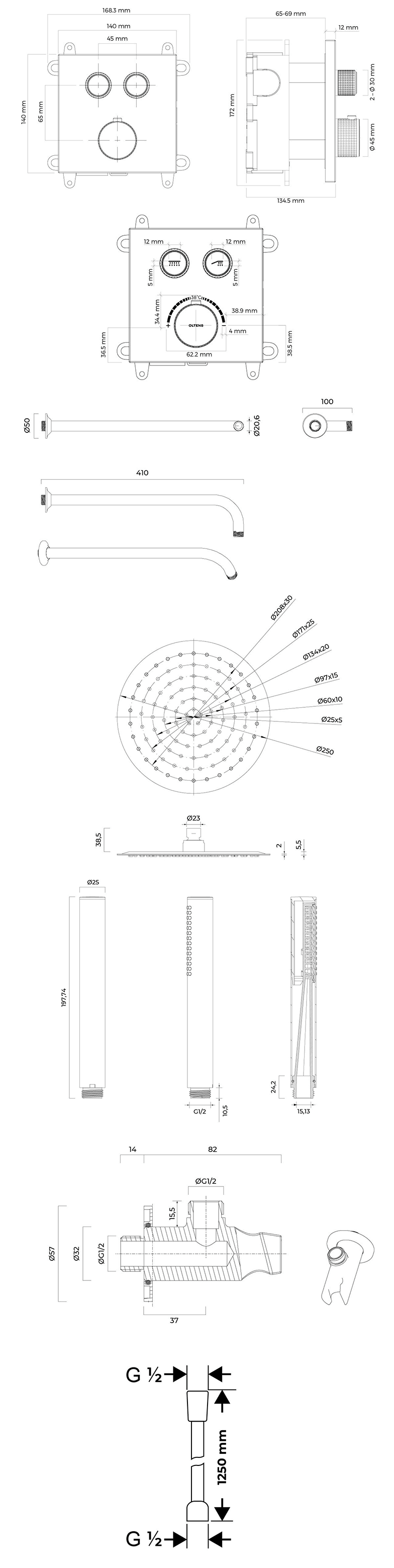 Opis zestawu Zestaw Oltens Onega (S) bateria podtynkowa z deszczownicą 25 cm Vindel i kompletem prysznicowym Ume chrom 36620100