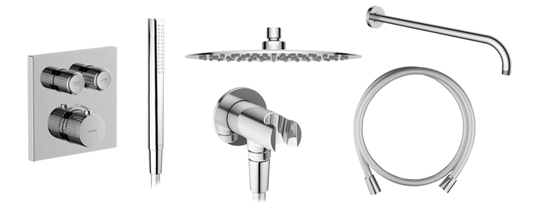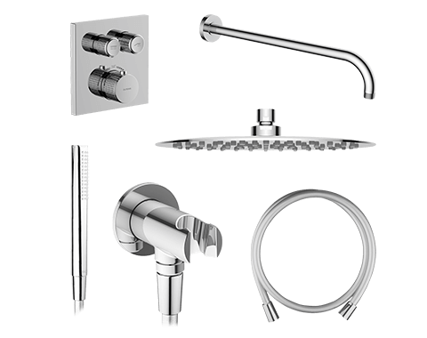 | W zestawie: | bateria z przełącznikiem, deszczownica, słuchawka prysznicowa, wąż prysznicowy, ramię natrysku, przyłącze kątowe |