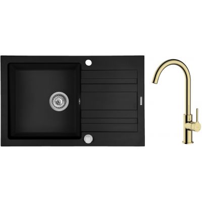 Zestaw Pyramis Naxos zlewozmywak granitowy 79x50 cm z baterią kuchenną Oltens Skafta czarny mat/złoty połysk (070174301, 35206800)